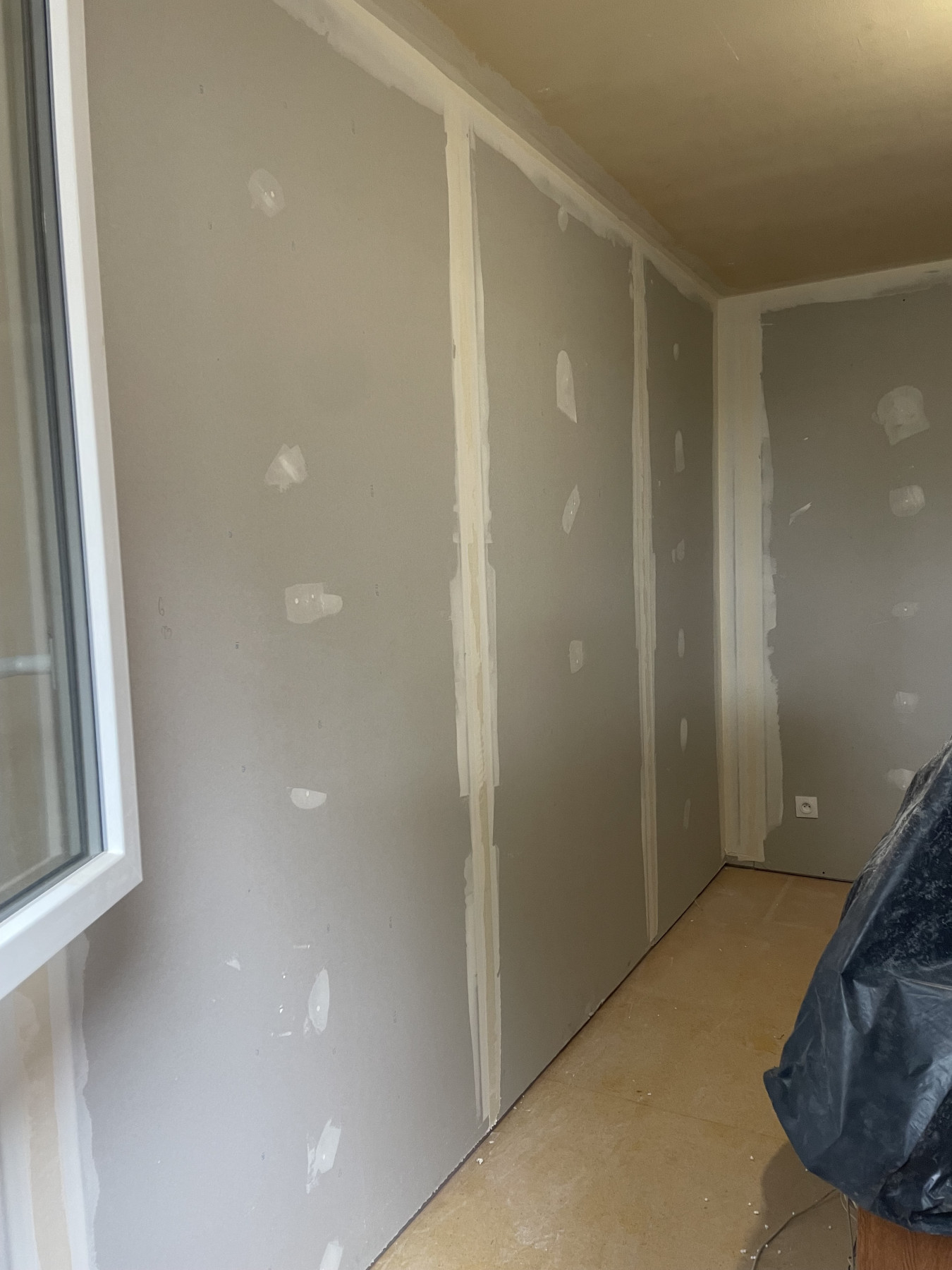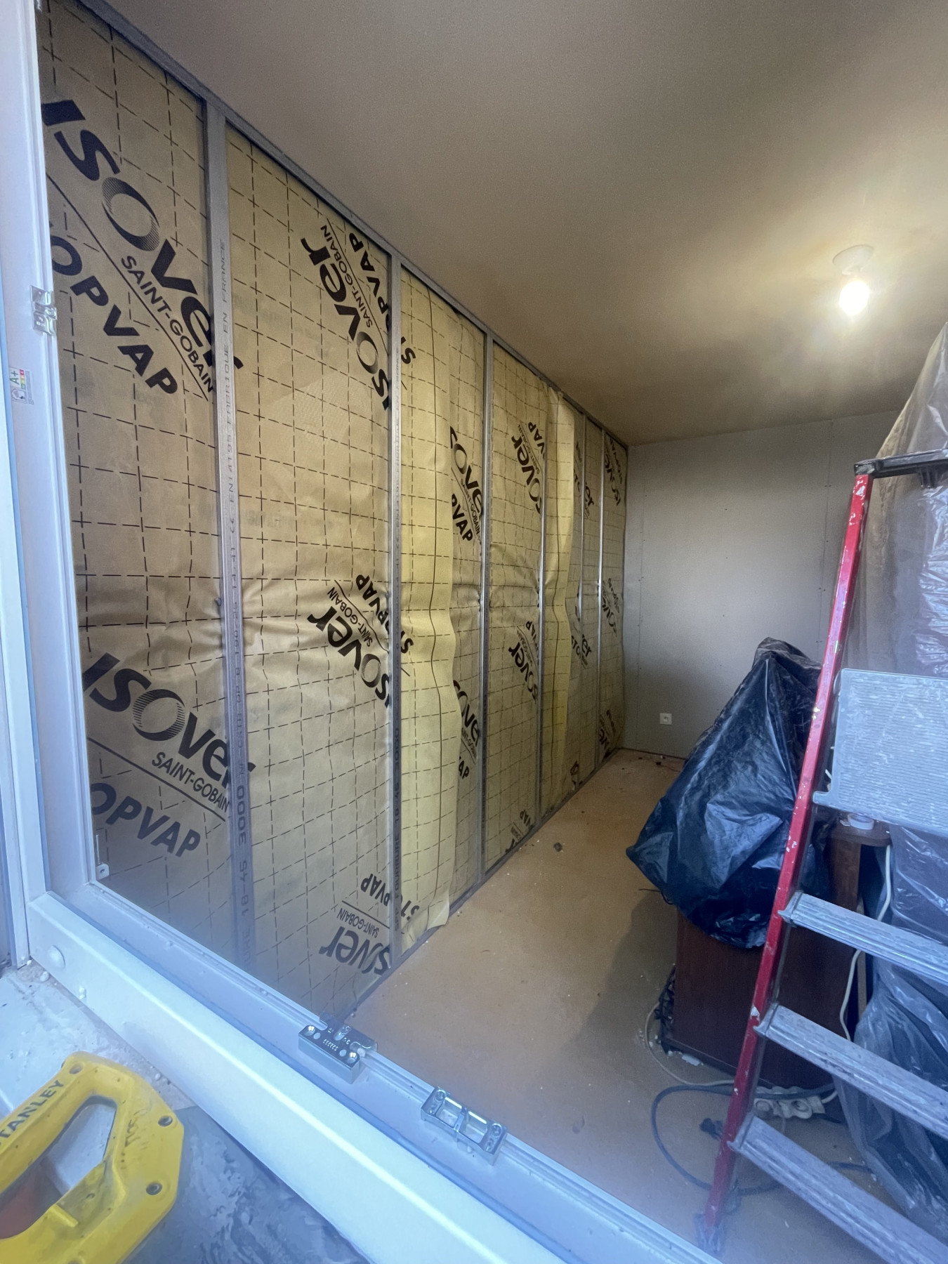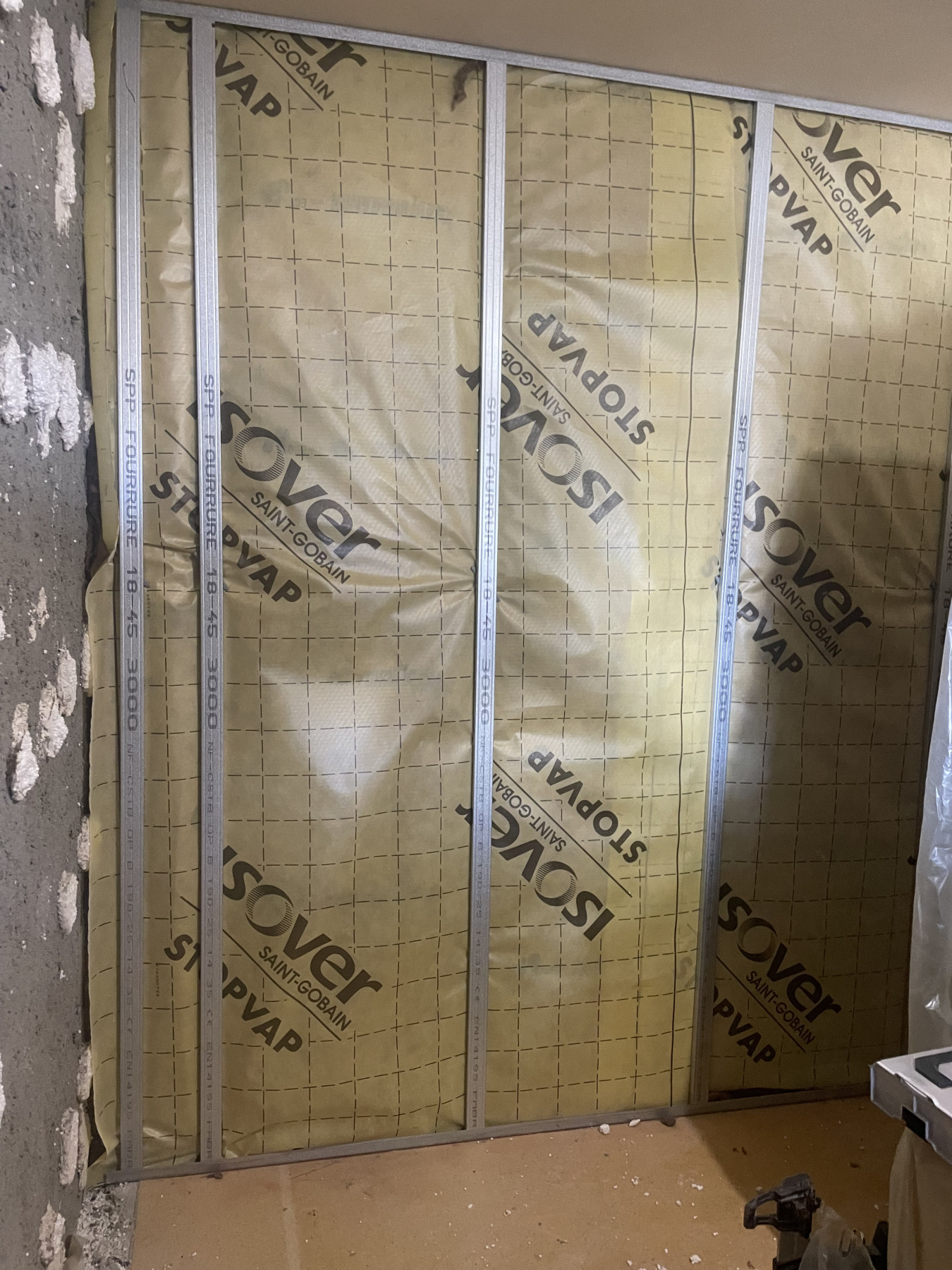 - Réalisation d'une contre cloison pour doublage thermique 13+120mm avec la mise en place d'une membrane