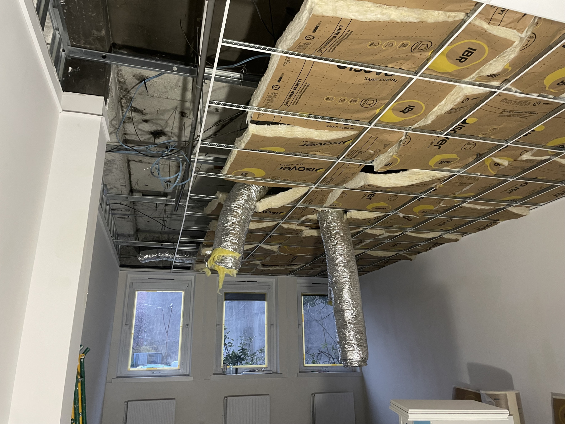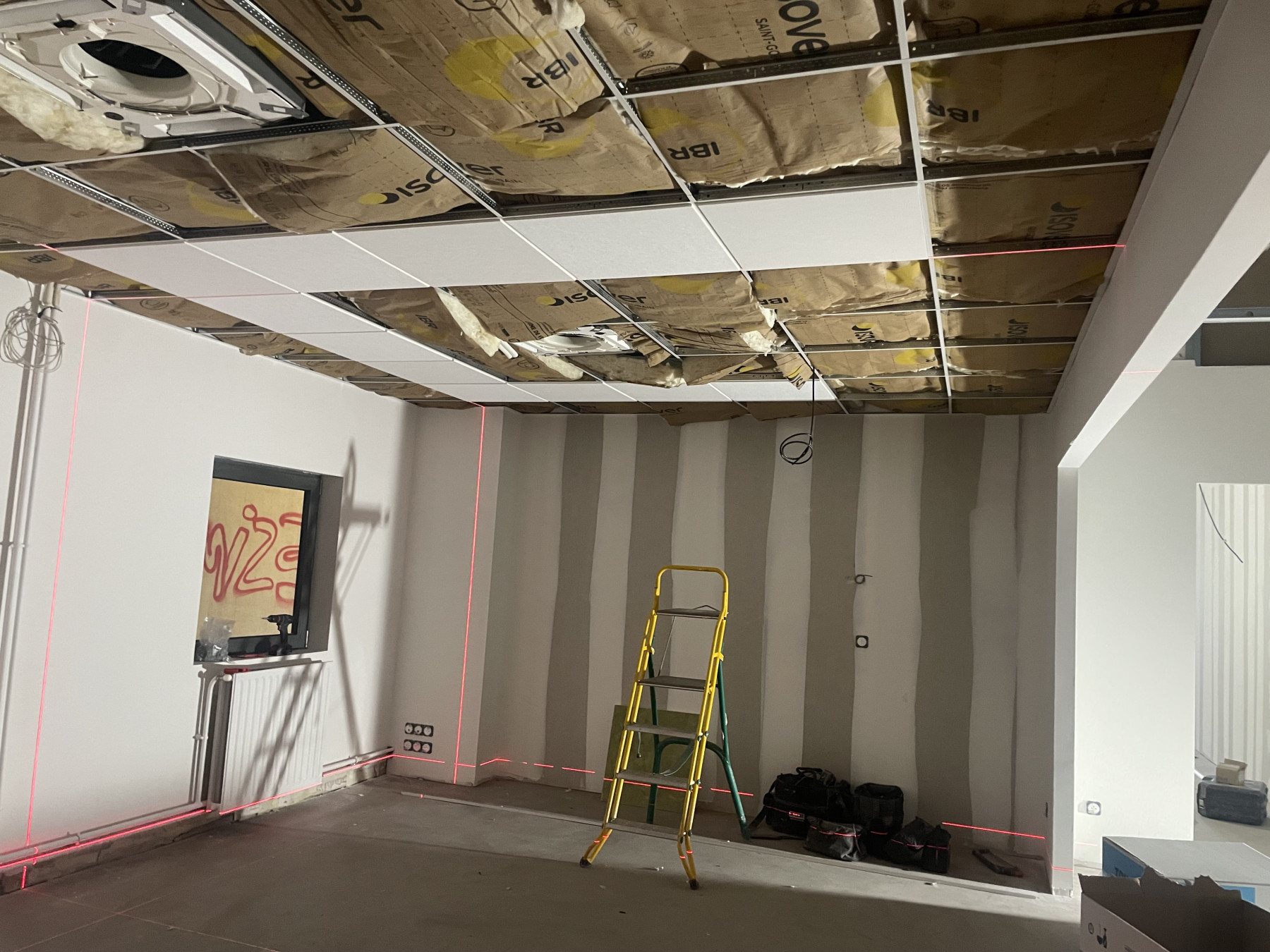 Réalisation de travaux d’aménagement intérieur comprenant la pose de plafonds en dalles 60x60 avec ossature semi-encastrée laquée, finition blanche et intégration d’un isolant.