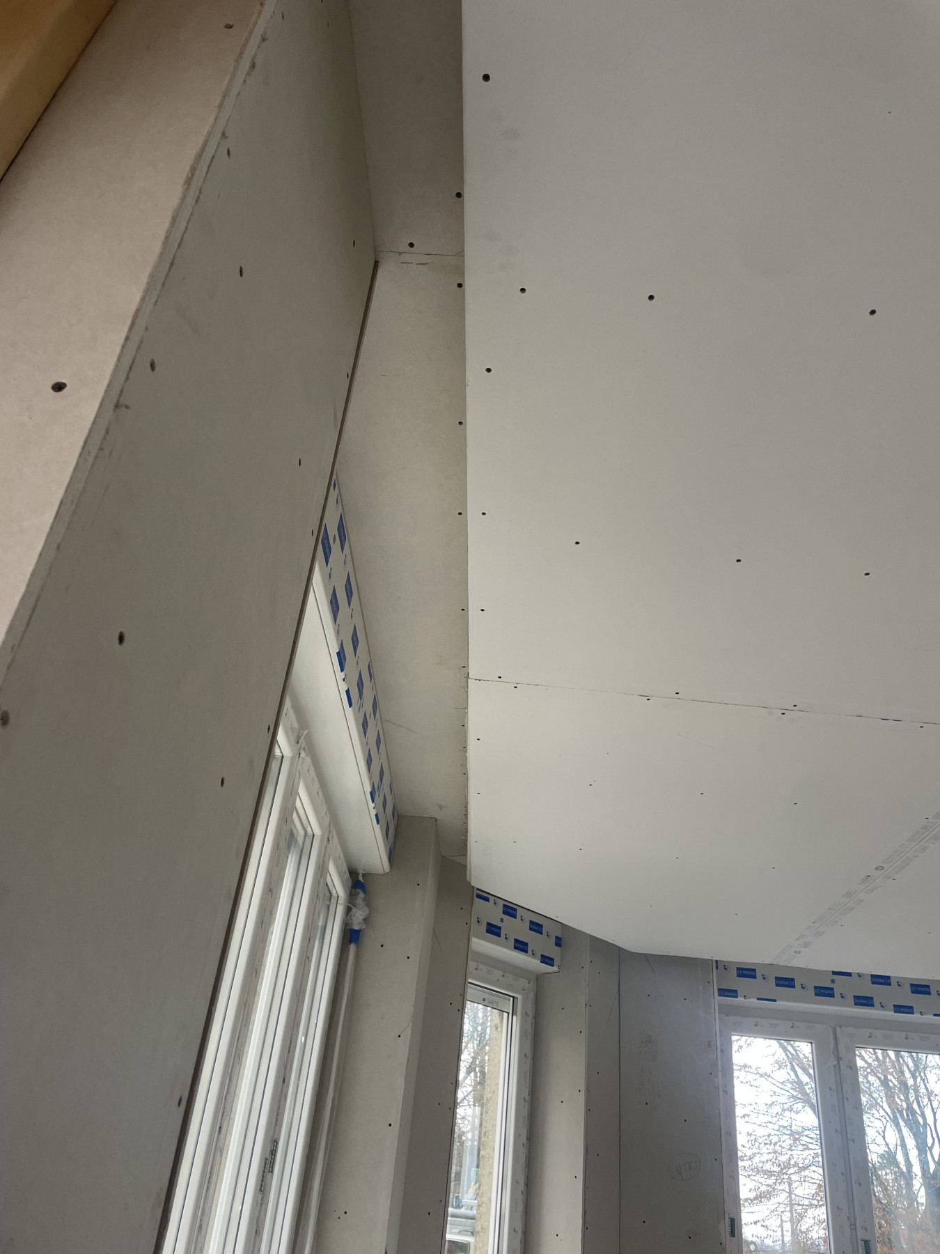 -La fourniture et pose d'une laine de verre ISOCONFORT 35 revêtu KRAFT épaisseur 240mm y compris parement BA13 vissé sur rails et enduits calicots. Localisation : plafonds