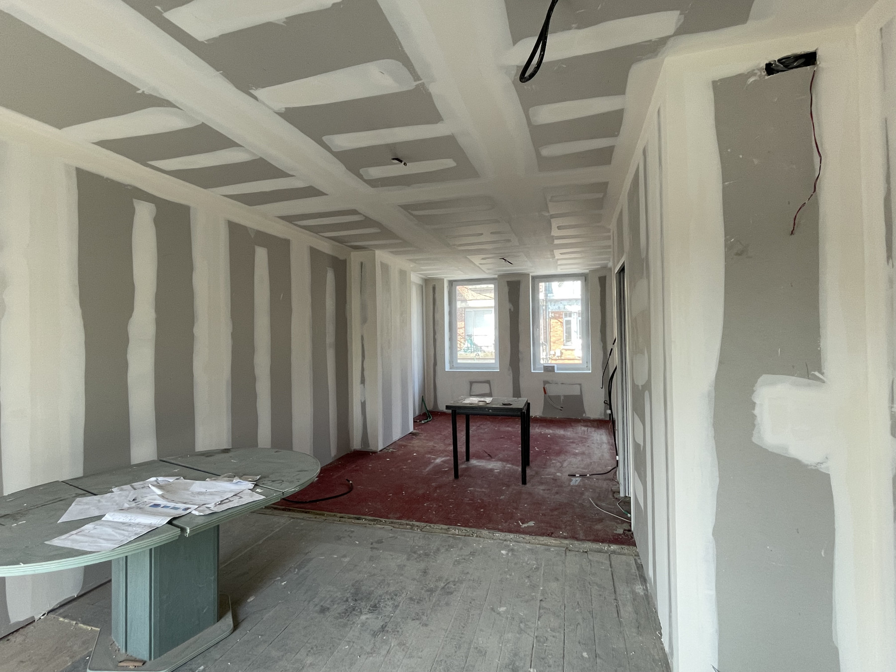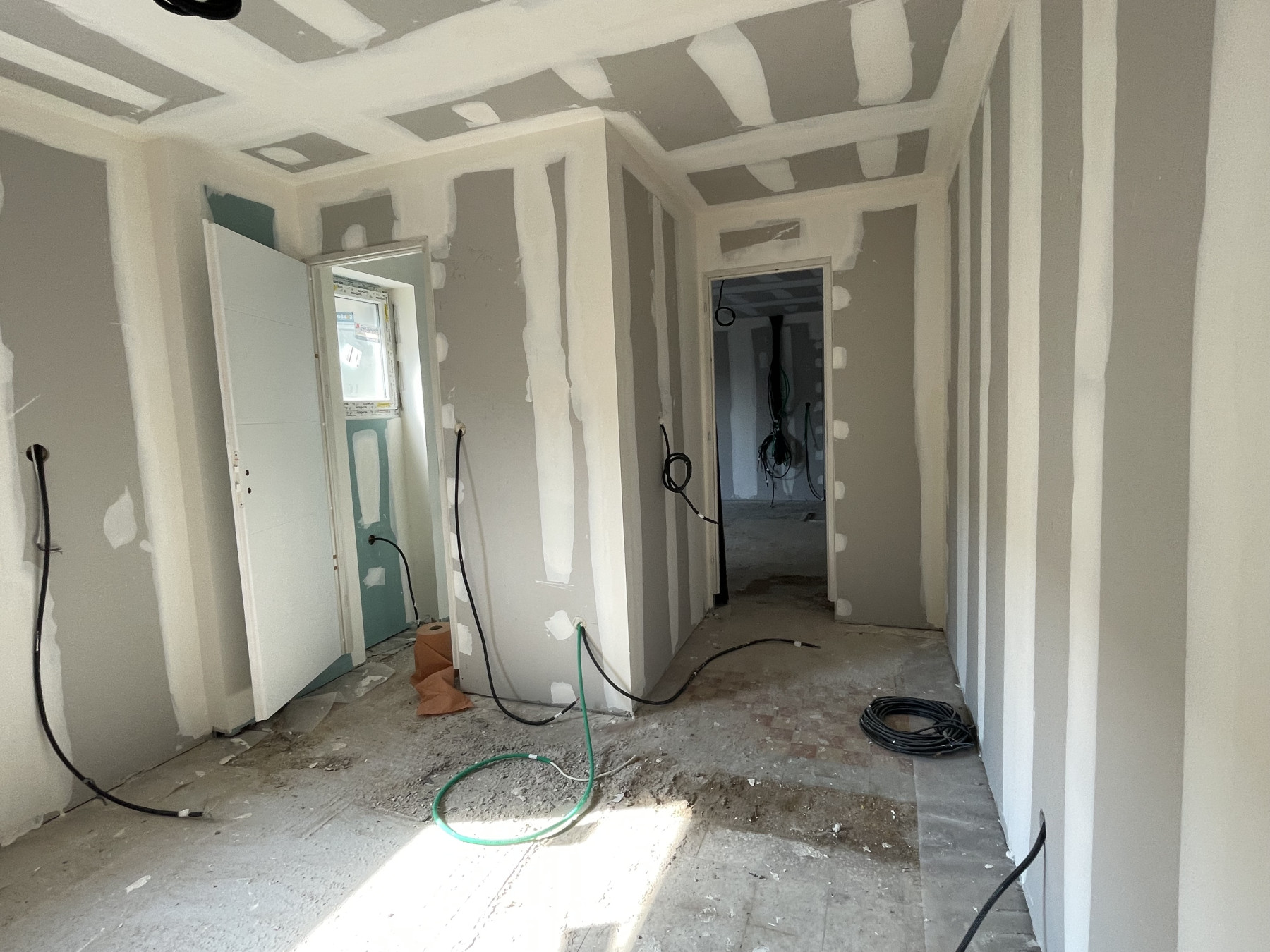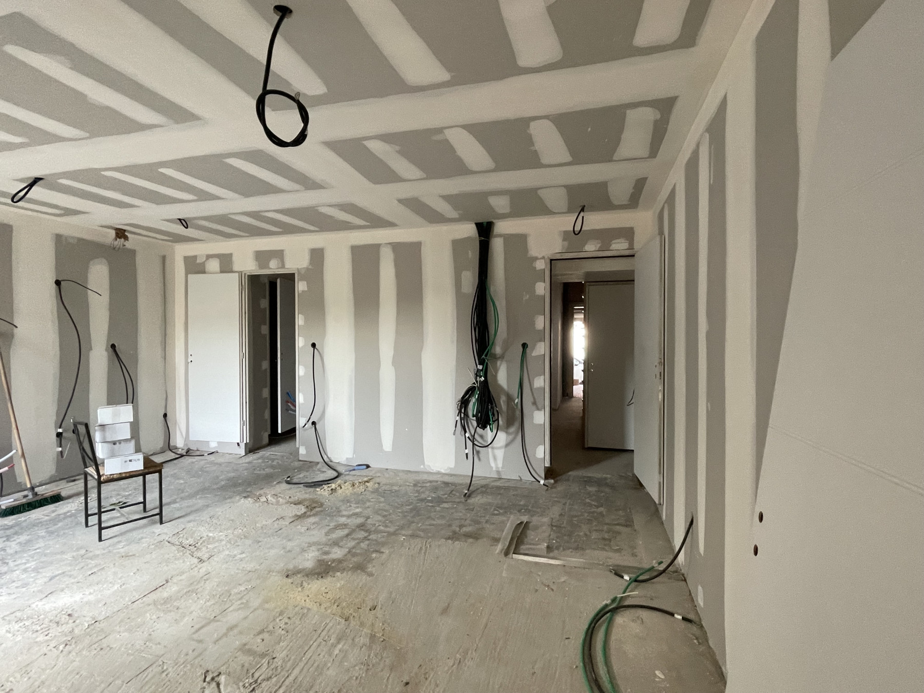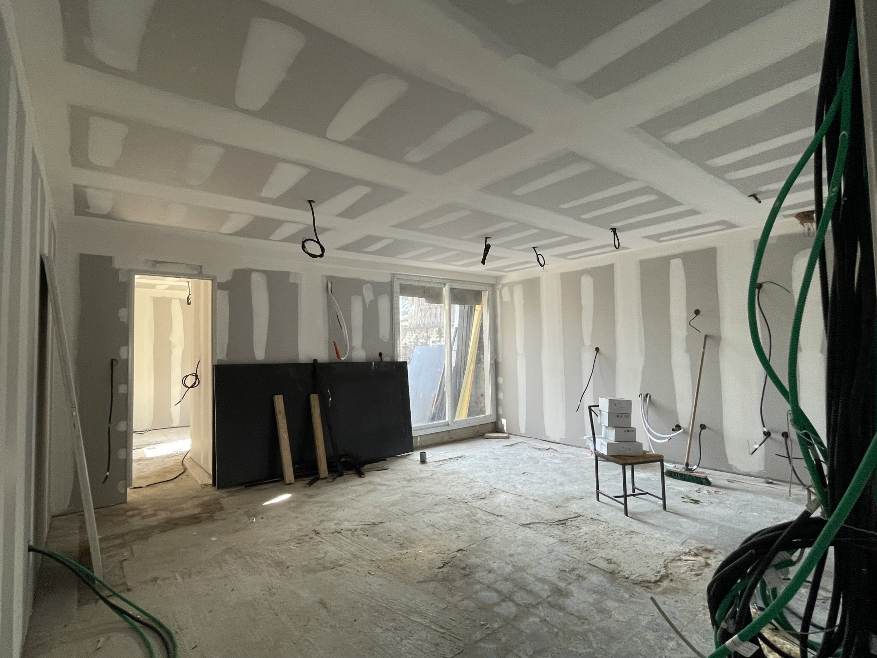 Pose de BA13 sur les murs porteurs.